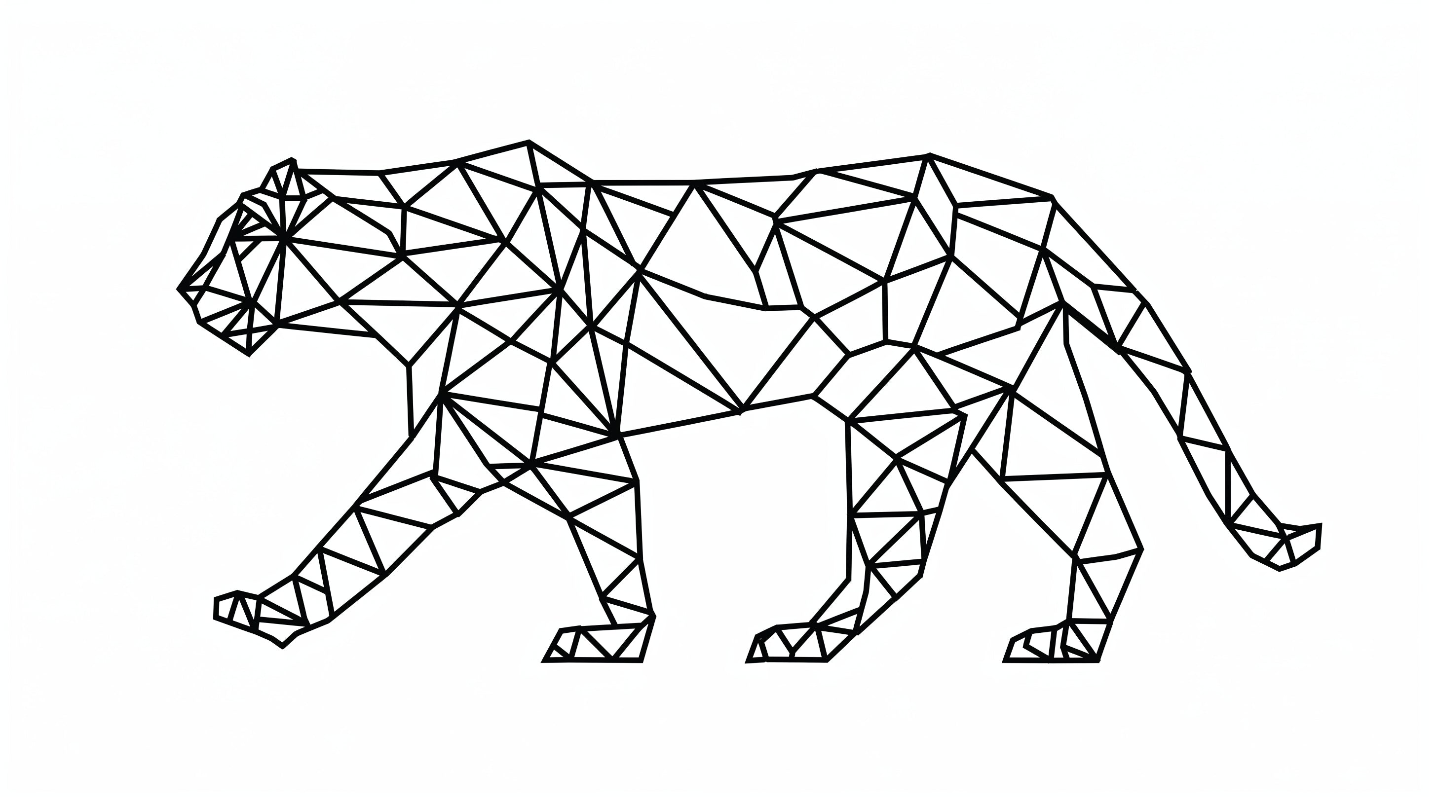Ce papier peint panthère géométrique présente une interprétation moderne saisissante de la nature à travers des formes angulaires précises. Les lignes noires audacieuses créent un réseau complexe de formes triangulaires, formant un grand félin majestueux en mouvement sur un fond blanc net. Le papier peint animal géométrique combine la précision mathématique avec la grâce artistique, résultant en un design polygonal contemporain qui capture l'essence du minimalisme moderne.