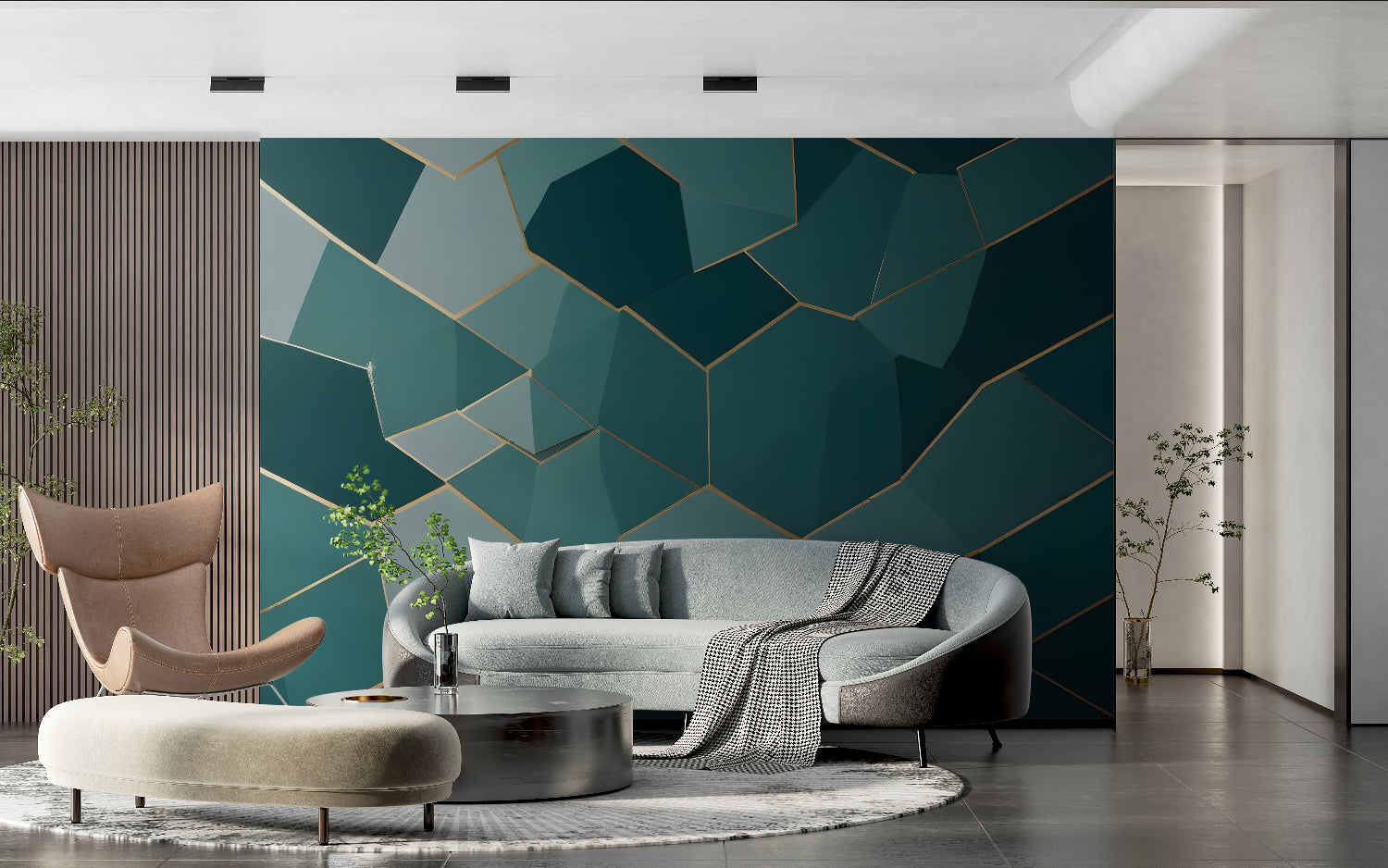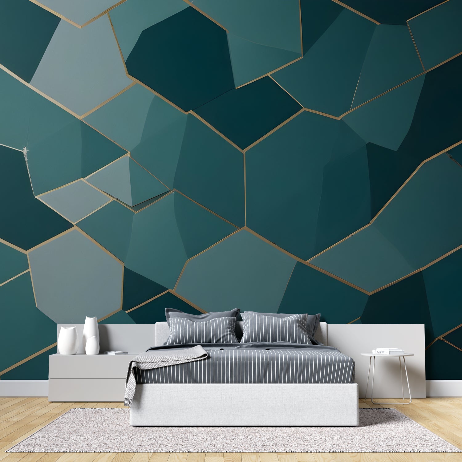 Papier Peint Mural Géométrique | Motif Moderne Bleu Sarcelle et Or