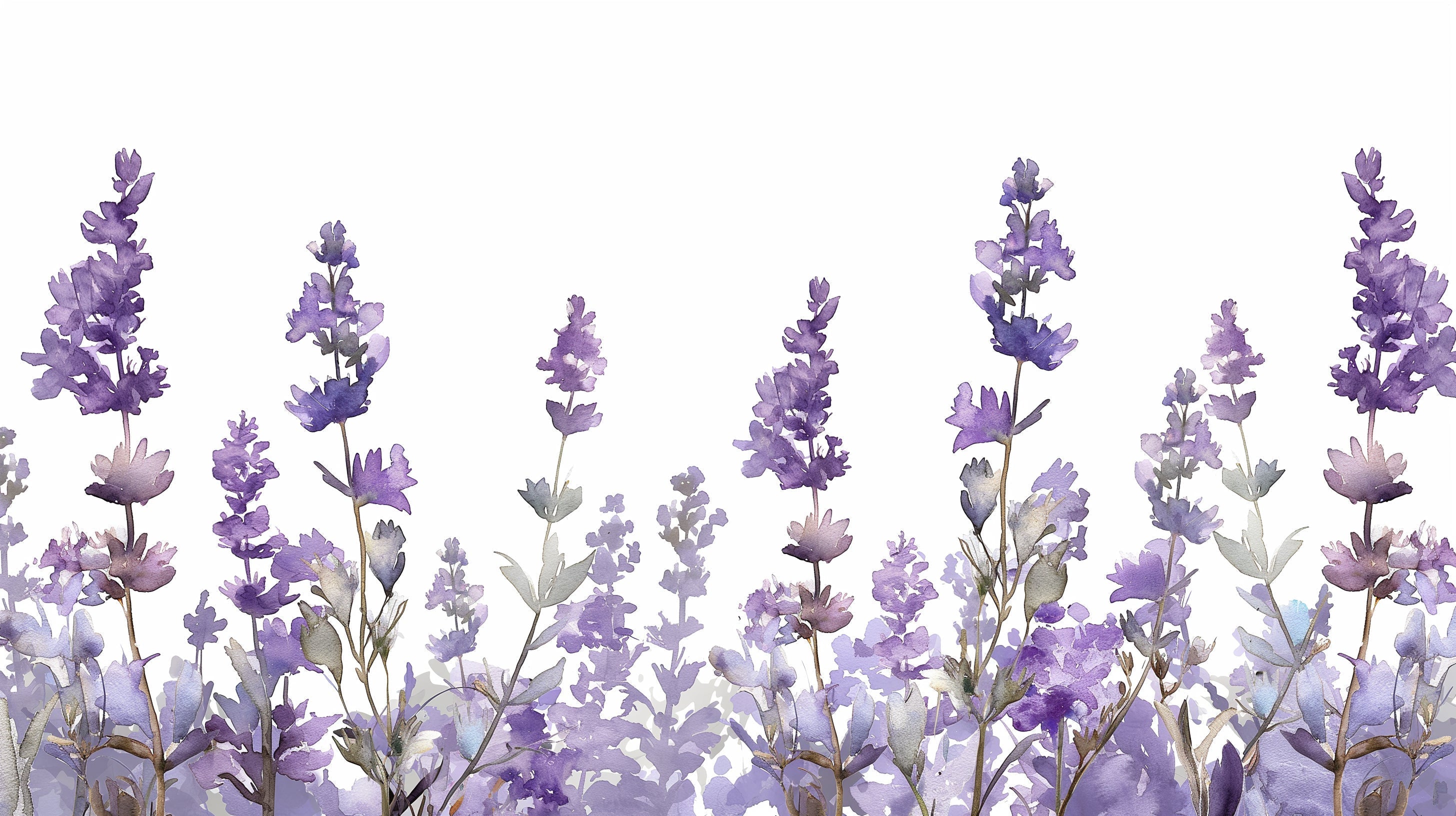 Cette fresque murale papier peint lavande capture la beauté éthérée des fleurs emblématiques de Provence à travers une délicate aquarelle artistique. Les tiges gracieuses s'élèvent à différentes hauteurs, ornées de fleurs violet doux qui se fondent dans un feuillage gris-vert brumeux. Chaque élément de papier peint floral violet est magistralement rendu avec des couches translucides de couleur, créant un jeu sophistiqué de lumière et d'ombre sur le fond blanc net.