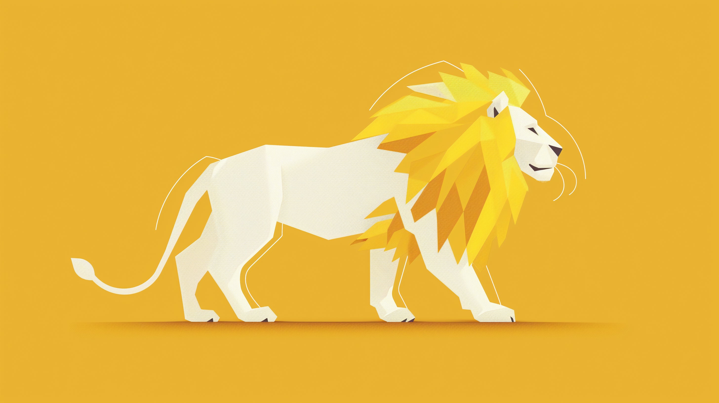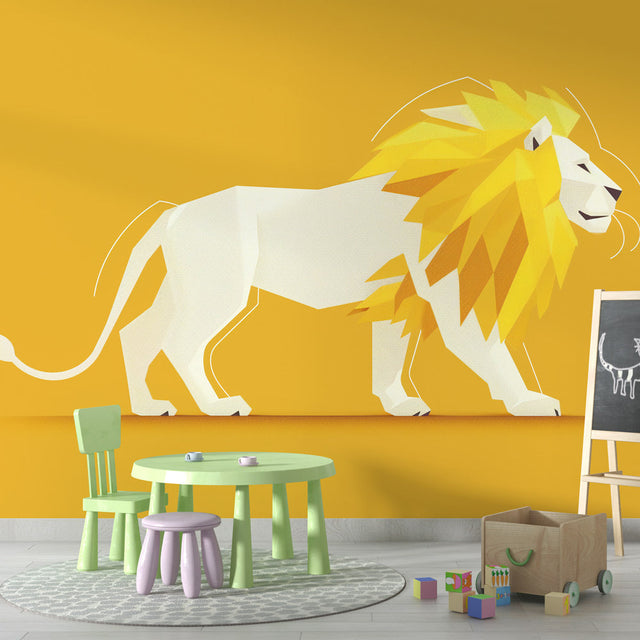 Ce papier peint lion géométrique présente un lion blanc majestueux avec une crinière dorée saisissante, rendue en formes angulaires audacieuses sur un fond jaune vibrant. Le design contemporain utilise des lignes épurées et des formes polygonales pour créer un papier peint animalier moderne qui capture l'essence noble de cette créature magnifique. Chaque plan géométrique fonctionne en harmonie pour former une représentation minimaliste mais puissante qui attire l'attention par sa précision artistique.