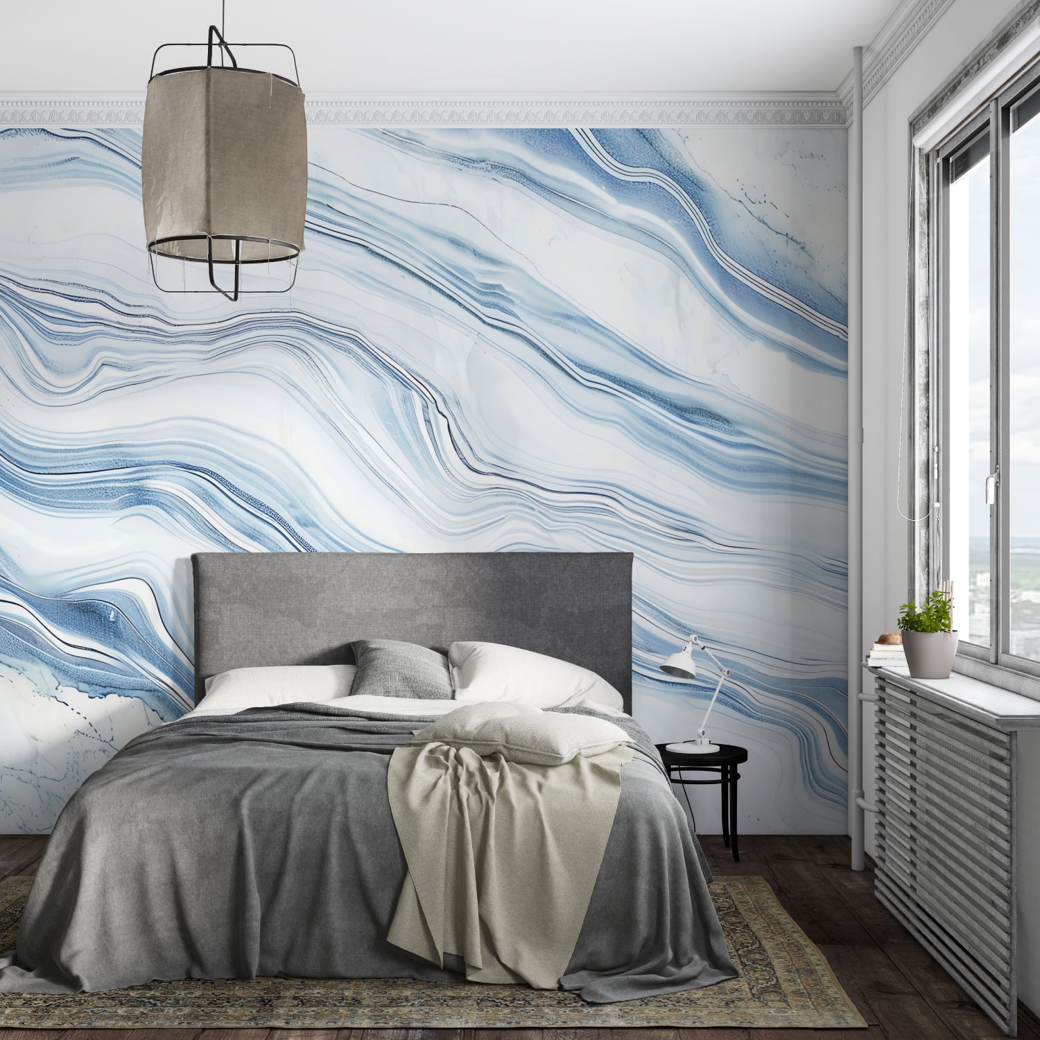 Papier Peint Mural en Marbre | Design Vague Bleue et Blanche