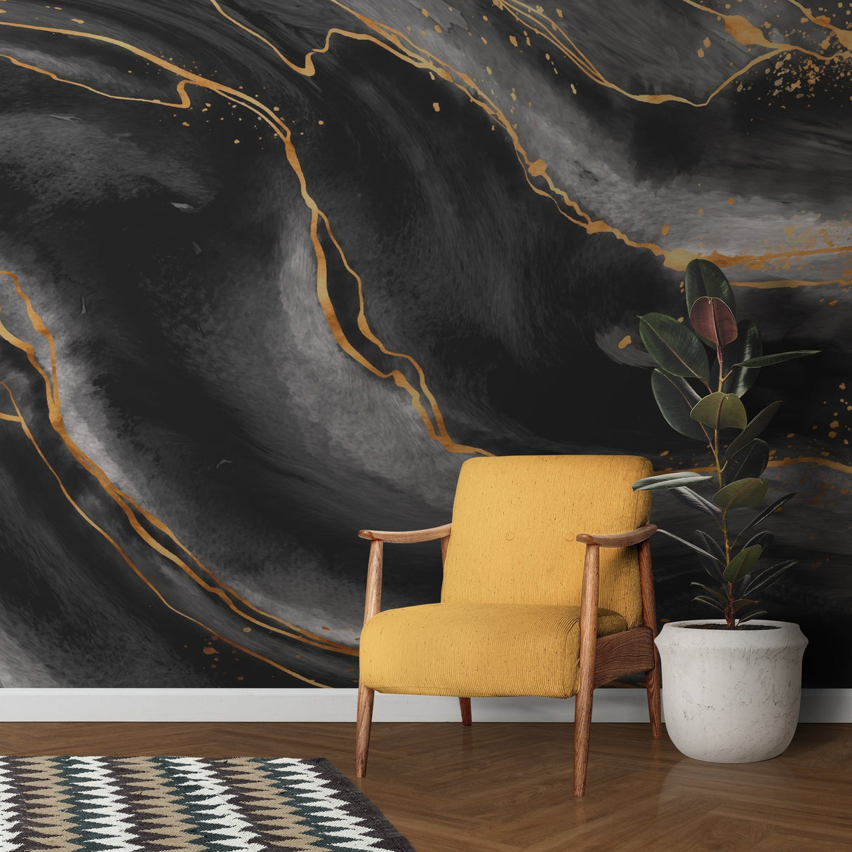 Papier Peint Mural en Marbre | Design Abstrait Noir et Or
