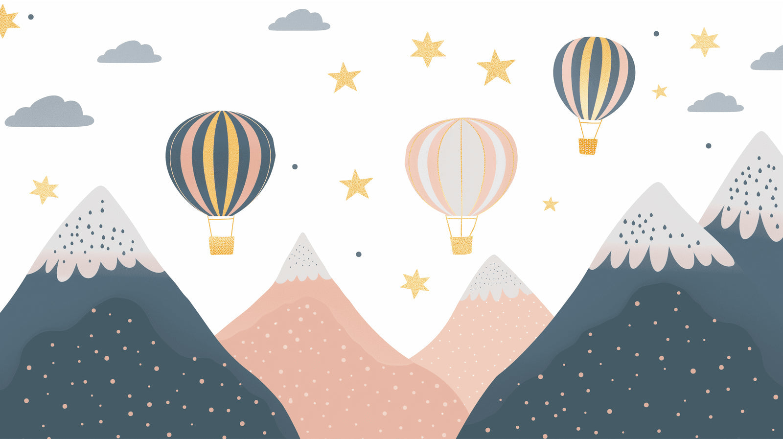Ce papier peint montgolfière enchanteur crée un paysage de rêve où des ballons d'inspiration vintage dérivent gracieusement devant un décor montagneux serein. Le design présente une palette sophistiquée de bleu sarcelle, rose blush et or, avec des étoiles scintillantes dispersées dans un ciel gris perle. La fresque murale montagne met en valeur des sommets enneigés parsemés de détails délicats, créant une composition fantaisiste mais raffinée qui stimule l'imagination.