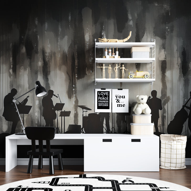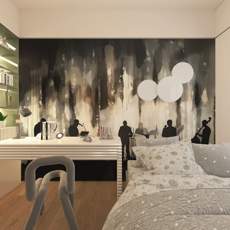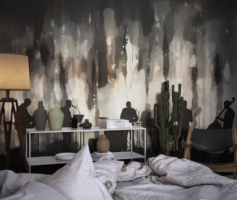 Ce papier peint à thème musical présente une composition artistique de silhouettes de musiciens de jazz sur un fond dramatique de coups de pinceau abstraits. L'interaction sophistiquée de charbon de bois, gris et beige crée une atmosphère mélancolique, tandis que les silhouettes noires des membres du groupe ajoutent profondeur et narration à la fresque murale musicale. Chaque figure, figée en pleine performance, contribue à l'énergie dynamique de ce design contemporain.