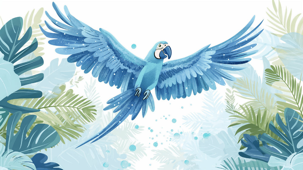 Ce papier peint oiseau tropical présente un magnifique ara bleu en plein vol, ses ailes déployées majestueusement sur un fond tropical de rêve. L'œuvre capture le mouvement gracieux de l'oiseau avec un détail saisissant, de ses plumes azur vibrantes à son bec courbé caractéristique. De délicates frondes de palmier et des feuilles de monstera encadrent la scène dans des tons doux de sauge et d'émeraude, tandis que des gouttelettes d'eau éthérées créent une atmosphère enchanteresse et magique.
