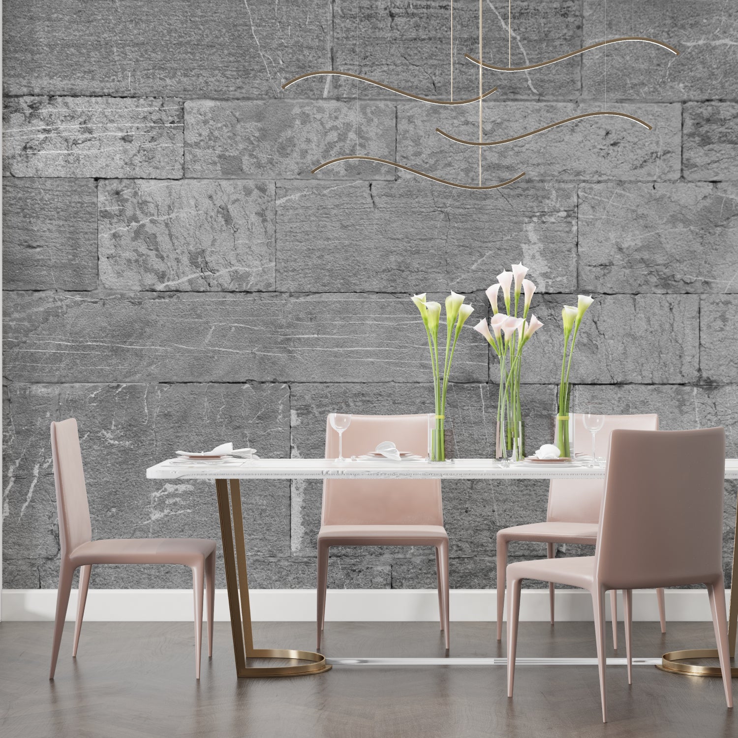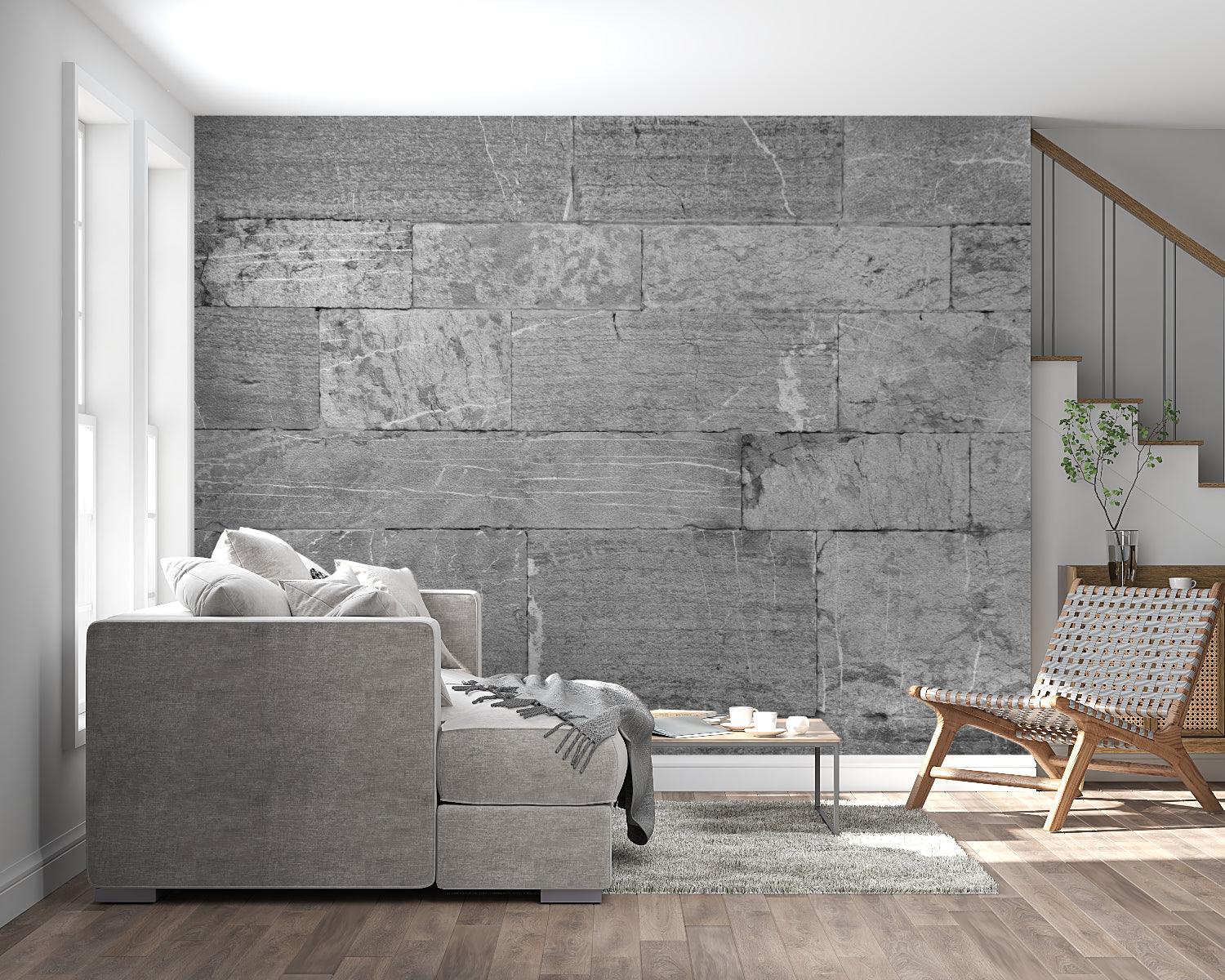 Les ombres et textures soigneusement travaillées font ressortir cette fresque murale moderne effet pierre sur vos murs.