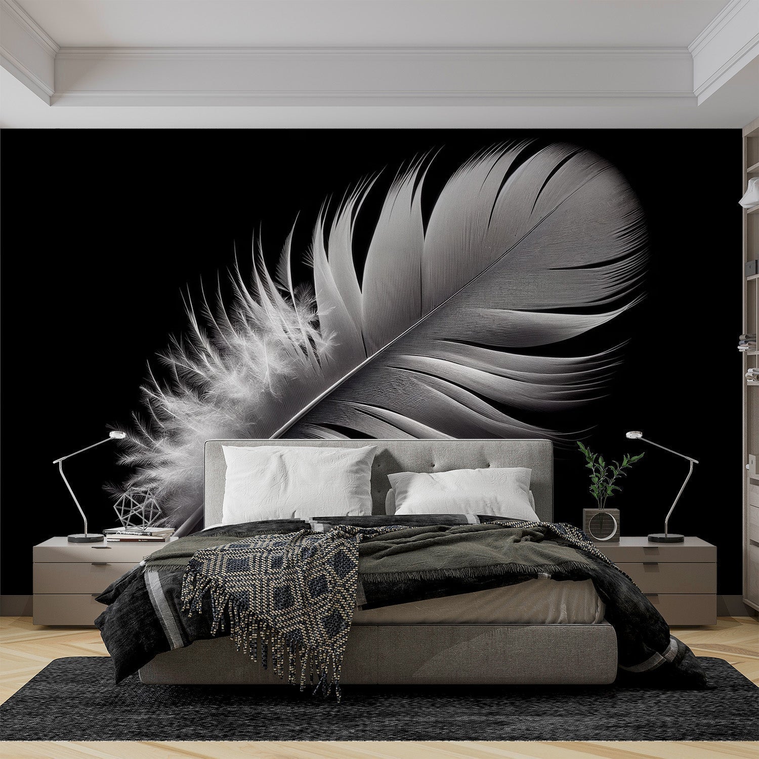 Notre fresque monochrome de plumes ajoute de la profondeur sans être envahissante.