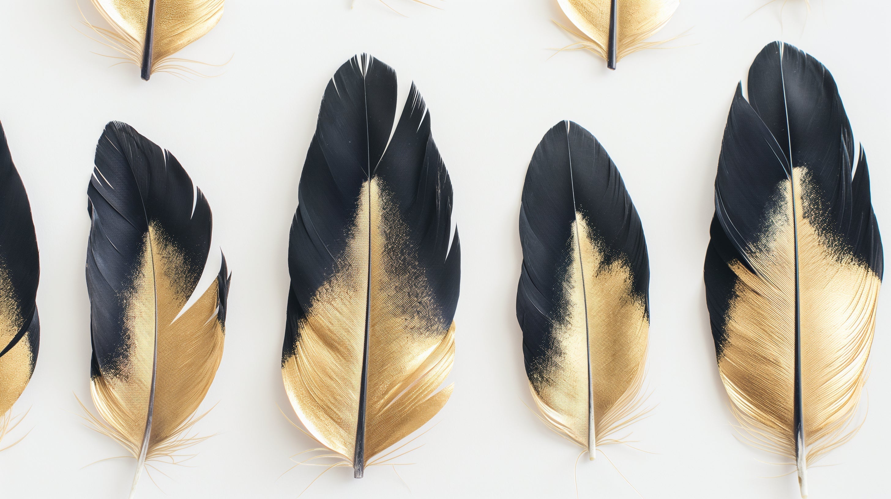 Ce papier peint à plumes noir et or présente une magnifique gamme de plumes surdimensionnées rendues dans une palette sophistiquée bicolore. Chaque plume méticuleusement détaillée semble flotter sur le fond blanc immaculé, avec des pointes d'ébène riches se dissolvant progressivement en bases métalliques dorées lumineuses. L'interaction texturale entre la définition nette des plumes et les coups de pinceau dorés éthérés crée une fresque murale moderne à plumes qui captive par sa précision artistique.