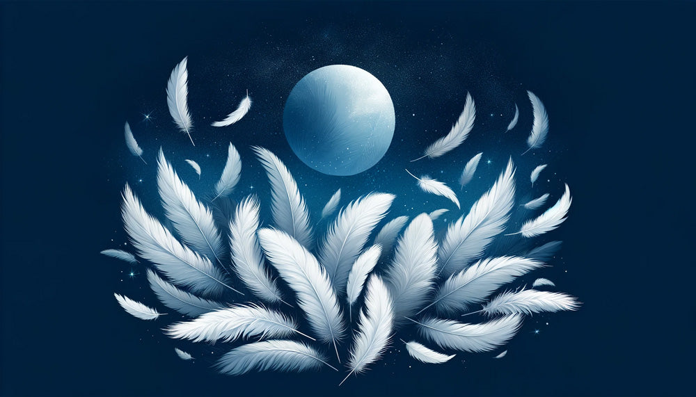 Cette fresque murale en papier peint à plumes enchanteresse capture la beauté éthérée des plumes blanches dansant sous une pleine lune lumineuse. Sur un fond bleu nuit profond parsemé d'étoiles scintillantes, les plumes blanches délicatement détaillées semblent flotter sans poids à travers la scène nocturne. La fresque murale céleste crée un jeu magistral de lumière et d'ombre, chaque plume étant rendue en blanc immaculé avec de subtiles nuances bleutées.