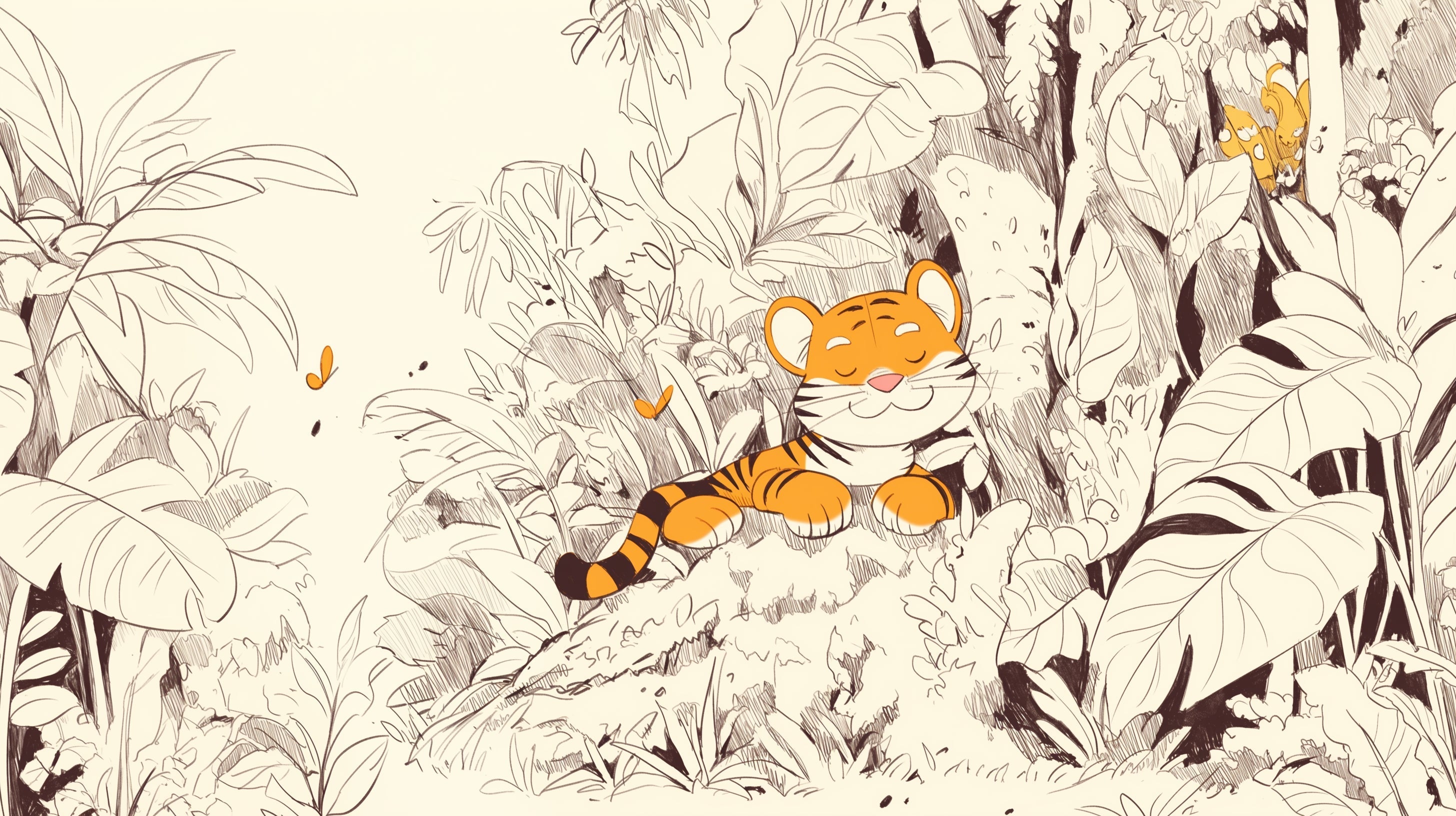 Ce charmant papier peint tigre présente une illustration délicieuse où un bébé tigre se prélasse paisiblement au milieu d'un feuillage en ligne fine. Le design combine habilement des feuilles de jungle au style croquis avec un personnage de tigre orange vif, créant un contraste enchanteur sur le fond beige doux. Des papillons joueurs dansent à travers le papier peint animaux de la jungle, ajoutant un mouvement fantaisiste à cette scène botanique sereine.