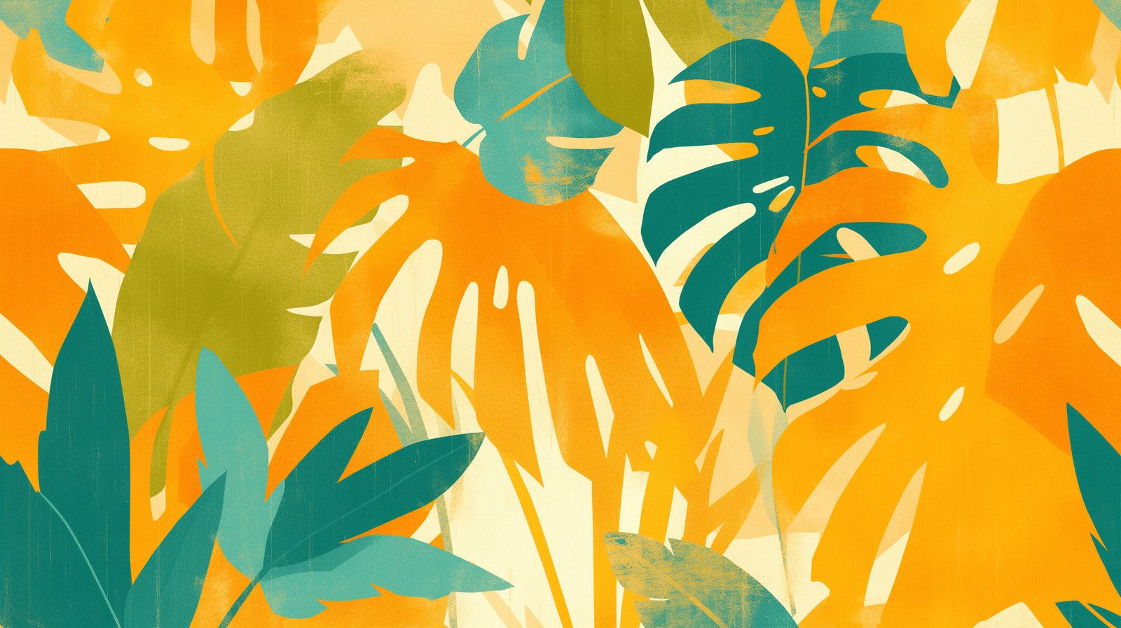 Ce papier peint à feuilles tropicales vibrant présente une interprétation artistique de grandes feuilles de monstera dans un style audacieux et contemporain. La composition dynamique met en scène un feuillage lumineux orange et vert sarcelle sur un fond doré chaud, créant un jeu de couleurs saisissant. Le design du papier peint monstera intègre des formes géométriques modernes et des éléments superposés qui donnent de la profondeur et du mouvement à l'ensemble de la composition.