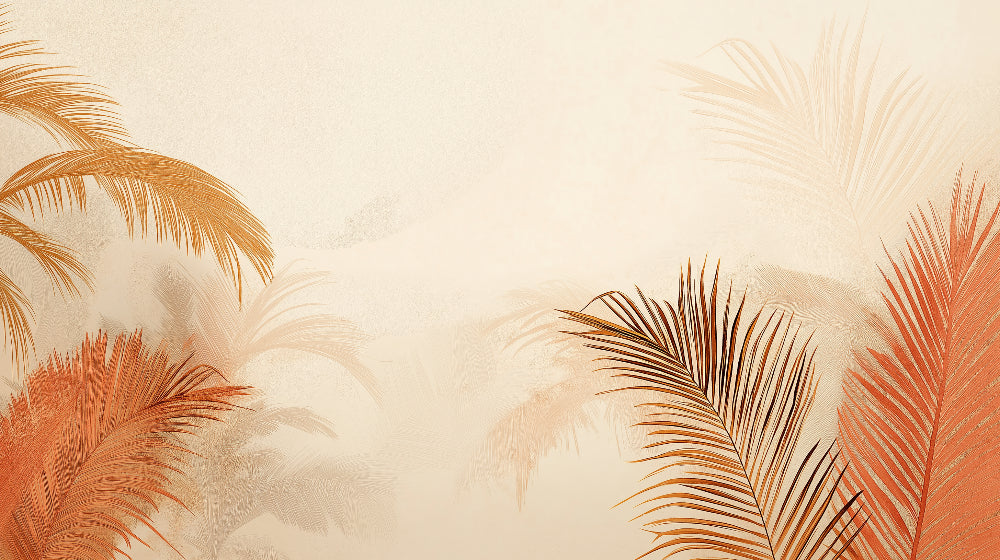 Ce papier peint palmier tropical présente une composition artistique de frondes de palmier gracieuses dans des tons chauds de terre cuite et dorés sur un fond beige serein. L'interaction délicate du papier peint feuillage exotique crée un rythme sophistiqué, avec des couches translucides de feuilles de palmier projetant des ombres douces qui ajoutent profondeur et dimension au design.