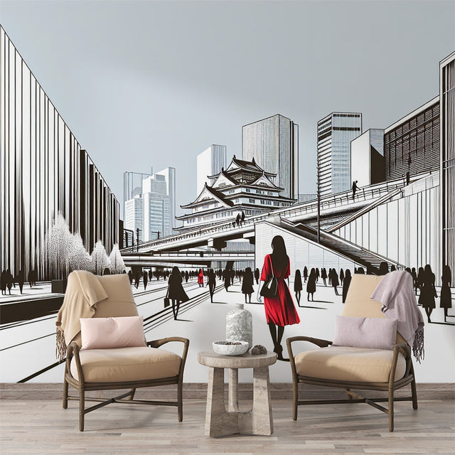 Papier Peint Mural Ville Japonaise | Scène Urbaine Avec Silhouette Rouge