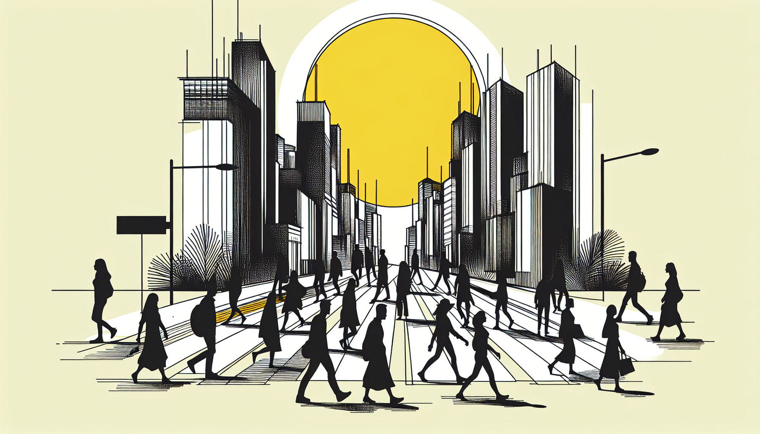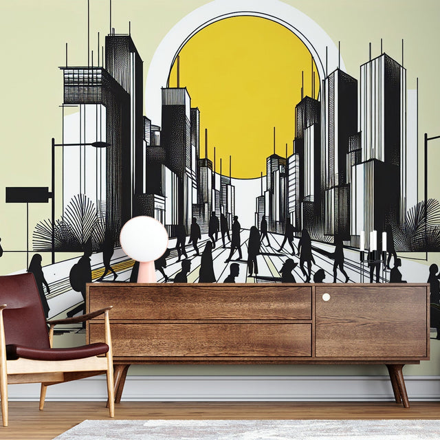 Ce papier peint skyline urbaine capture l'essence de la vie métropolitaine à travers un design minimaliste saisissant. Des silhouettes noires de gratte-ciel imposants s'élèvent sur un fond beige doux, tandis qu'un soleil jaune brillant crée un point focal dramatique. Le papier peint ville moderne présente des éléments architecturaux détaillés et des feuilles de palmier, complétés par le motif rythmique de silhouettes de piétons se déplaçant dans le paysage urbain.