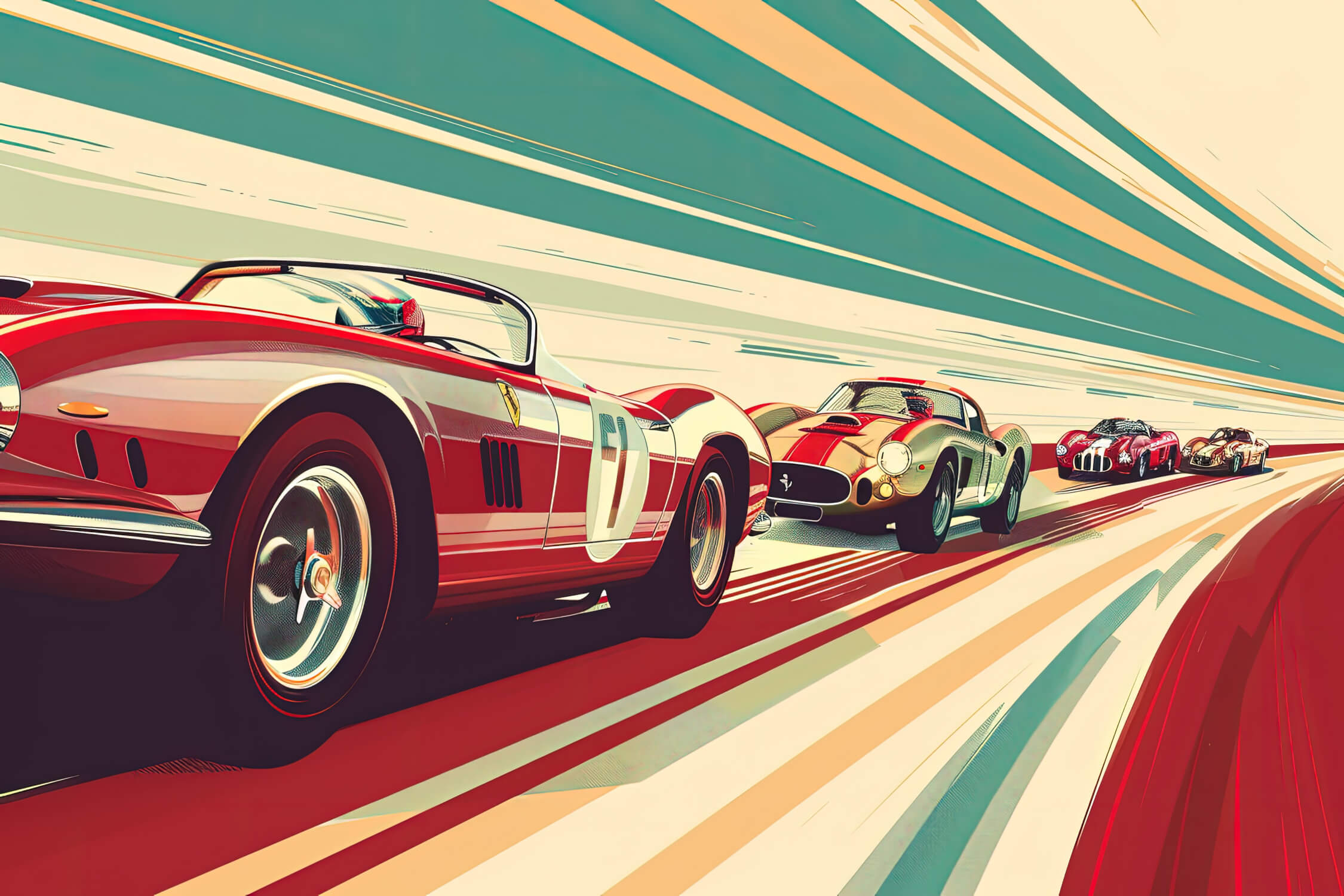Ce papier peint de course vintage donne vie à la vitesse classique avec des rouges et des verts-bleus audacieux.