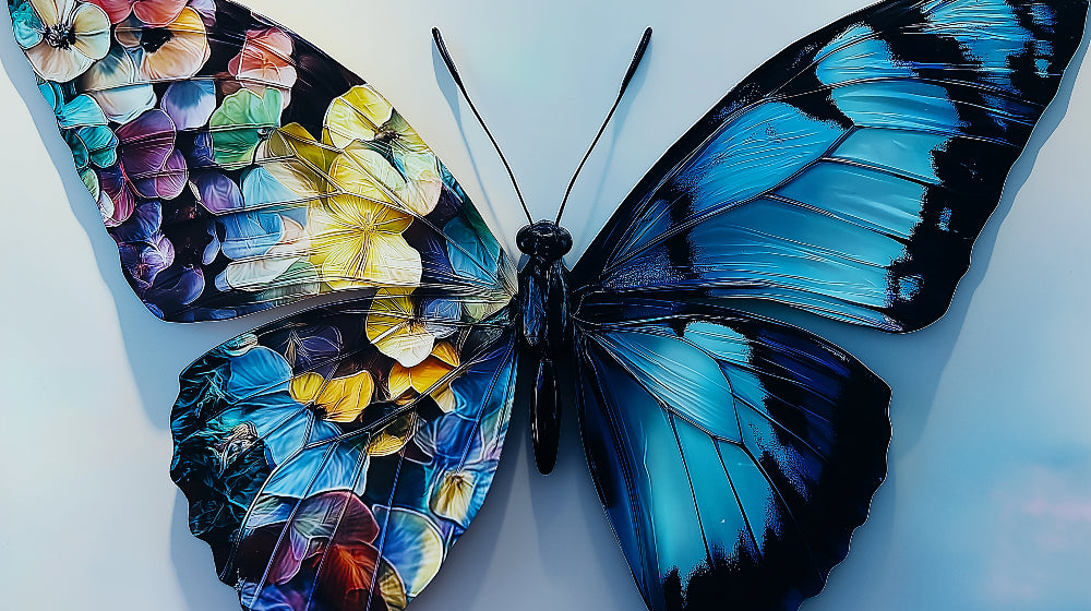 Cette fresque murale papillon présente une interprétation artistique saisissante où la nature rencontre le design moderne. Une aile affiche une mosaïque complexe de fleurs multicolores en nuances de jaune, rose, violet et turquoise, créant un effet kaléidoscopique vibrant. L'autre aile présente un dégradé dramatique de motifs de papillons bleus, passant d'un bleu marine profond à un turquoise éclatant, avec des segments géométriques précis qui capturent la structure délicate de l'architecture naturelle des ailes.