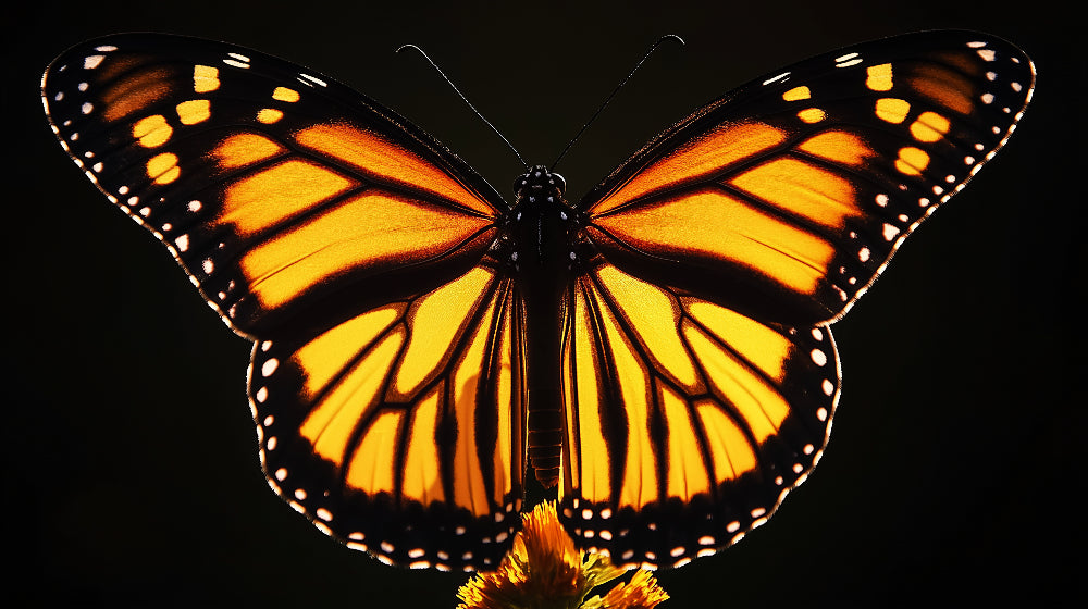 Cette fresque murale papillon capture la beauté majestueuse d'un papillon Monarque avec un détail saisissant. La composition dramatique met en valeur des ailes orange-doré lumineuses ornées de veines noires complexes, créant un point focal puissant sur le fond noir profond. Chaque motif délicat et détail des ailes de papillon est rendu avec une précision photographique, tandis que des accents blancs en pointillés le long des bords des ailes ajoutent une qualité éthérée à ce design captivant.