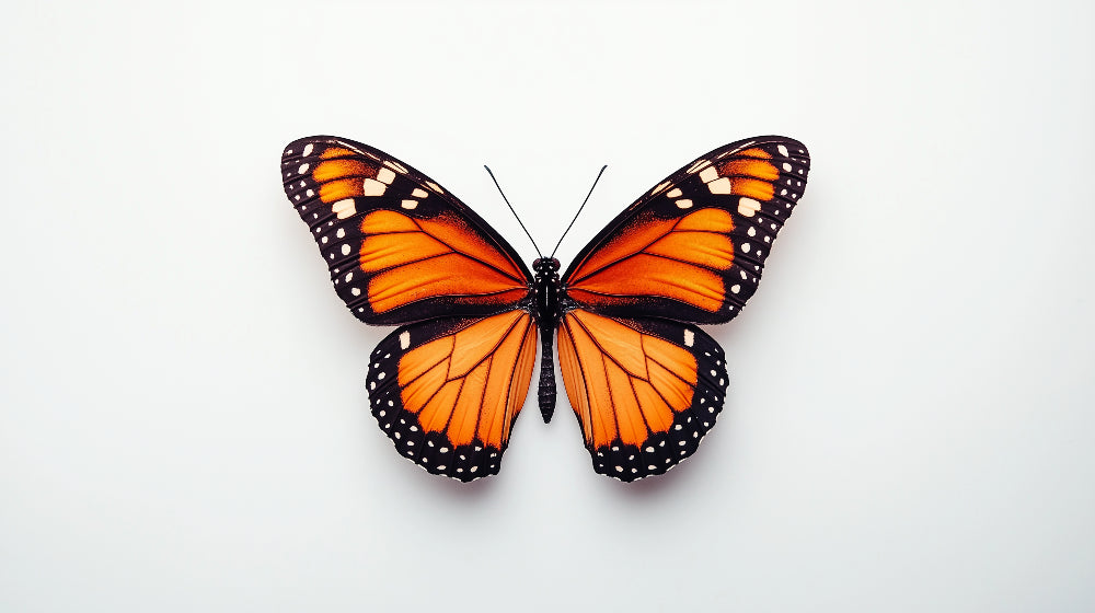 Cette captivante fresque murale papillon présente un majestueux papillon Monarque en détail photographique saisissant. Les ailes orange vibrantes affichent un réseau complexe de veines noires et des bordures distinctives ponctuées de blanc, créant un point focal puissant sur le fond blanc net. Chaque détail délicat de ce papier peint insecte est rendu avec une clarté exceptionnelle, des dégradés subtils des motifs d'ailes aux bordures pointillées précises qui caractérisent ces créatures remarquables.