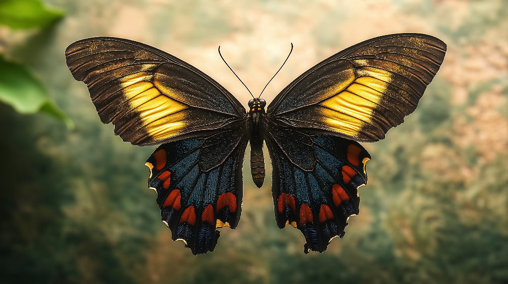 Cette fresque murale papillon présente un spécimen magnifique capturé avec un détail époustouflant. Les ailes affichent une combinaison magistrale d'une base noire riche ornée de rayures dorées lumineuses sur les parties supérieures, tandis que des accents bleu métallique et rouge vif créent un motif saisissant le long des ailes inférieures. Chaque veine délicate et texture subtile est rendue avec une clarté exceptionnelle, faisant de ce papier peint inspiré de la nature un témoignage de l'art naturel.
