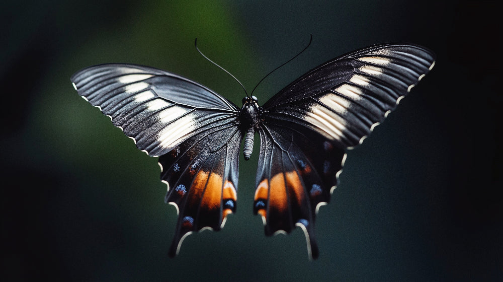 Cette peinture murale papillon capture le détail fascinant d'un spécimen majestueux en photographie macro époustouflante. Le contraste dramatique entre les rayures blanc argenté et les ailes noir profond crée un jeu sophistiqué de lumière et d'ombre, tandis que des touches d'orange vif et de taches bleues subtiles ajoutent une chaleur captivante. Le papier peint papillon noir met en valeur l'art de la nature à travers les bords délicatement festonnés des ailes et les motifs veineux complexes sur un fond vert foncé doux.