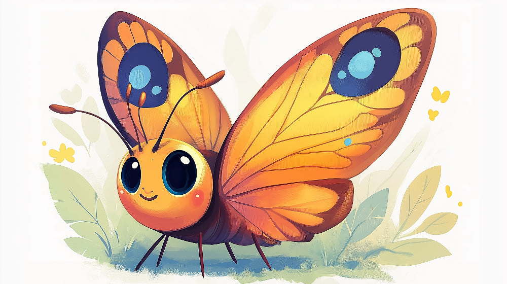 Cette fresque murale papillon présente un personnage animé charmant avec de magnifiques ailes orange-doré qui rayonnent de chaleur et de joie. L'illustration détaillée met en avant de grands yeux bleus captivants et une expression amicale, sur un fond doux et brumeux avec un feuillage vert délicat. Le papier peint insecte animé combine des teintes orange vibrantes avec des accents bleu marine profonds, créant une harmonie visuelle saisissante qui attire immédiatement l'attention.