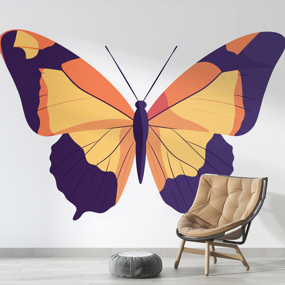 Ce papier peint papillon géométrique présente une interprétation audacieuse et contemporaine de l'insecte le plus gracieux de la nature. La composition saisissante met en scène un papillon à grande échelle rendu dans une palette de couleurs sophistiquée de violet profond, jaune chaud et orange corail. Les lignes épurées et le design papillon moderne créent une déclaration visuelle puissante, tandis que le motif symétrique démontre une précision artistique et une beauté minimaliste.