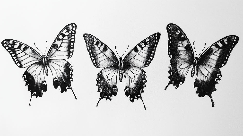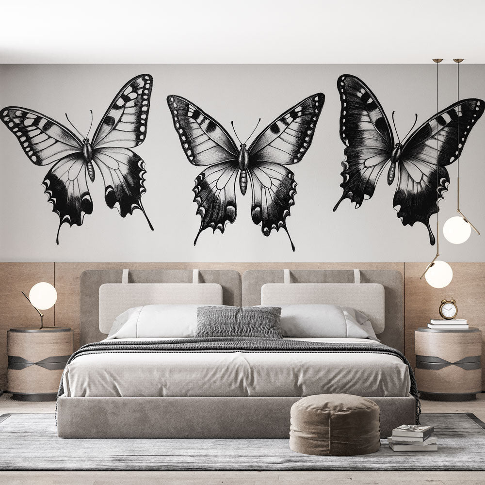 Cette saisissante fresque murale papillon présente trois papillons majestueux rendus dans un art sophistiqué en noir et blanc. Chaque illustration monochrome de papillon affiche un détail extraordinaire, des motifs complexes des ailes aux antennes délicates, créant un mélange harmonieux de beauté naturelle et d'expression artistique. Le dégradé d'ombrage et le travail précis des lignes apportent profondeur et dimension à ces créatures élégantes, leur donnant l'apparence de flotter gracieusement sur le fond clair.
