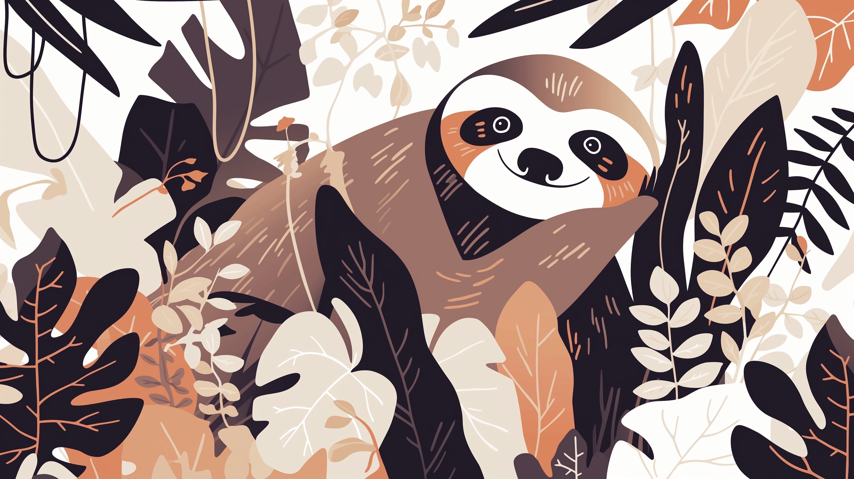 Ce papier peint paresseux présente une illustration charmante sur un fond tropical sophistiqué. Le design met en scène un personnage de paresseux amical rendu en tons bruns chauds, entouré de feuillage de jungle artistiquement stylisé. La composition équilibre des feuilles de monstera noires audacieuses avec des éléments botaniques beiges délicats, créant une interprétation contemporaine des formes naturelles. Les accents terre cuite et la palette neutre apportent chaleur et profondeur à l'agencement artistique.