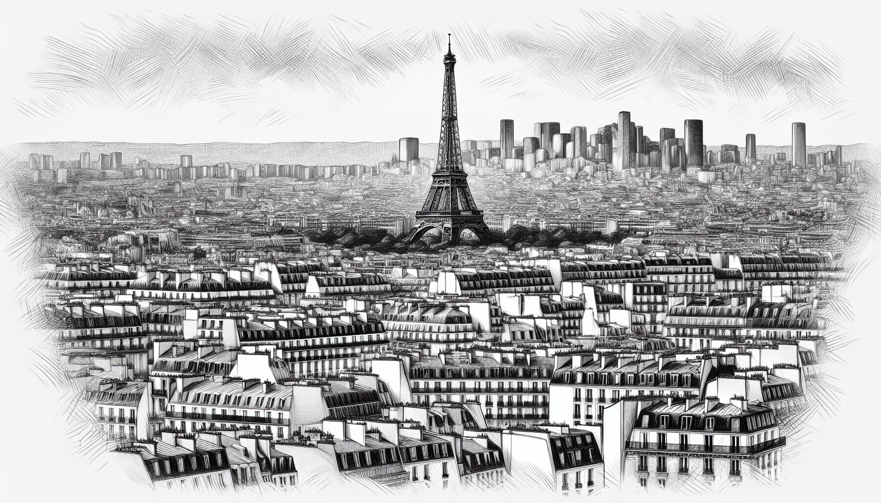 Ce papier peint paysage urbain de Paris capture la capitale française emblématique dans un style croquis saisissant en noir et blanc. La majestueuse Tour Eiffel se dresse comme un puissant élément central, s'élevant au-dessus des toits haussmanniens caractéristiques avec leurs cheminées et lucarnes distinctives. En arrière-plan, la silhouette moderne de La Défense crée un contraste dramatique avec l'architecture historique, tandis que le papier peint architectural met en valeur un travail de ligne méticuleux qui donne vie à chaque détail.