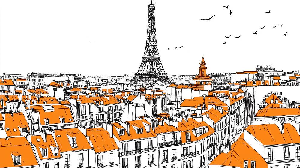 Ce papier peint paysage urbain de Paris capture le charme emblématique de la capitale française à travers un prisme artistique saisissant. Le contraste audacieux entre les toits en terre cuite orange et le travail précis en noir et blanc crée un panorama urbain sophistiqué. La majestueuse fresque murale de la Tour Eiffel se dresse fièrement contre le ciel, tandis que de délicats oiseaux planent au-dessus de la tapisserie architecturale de la ville composée d'immeubles haussmanniens, de flèches d'églises et de cheminées caractéristiques.