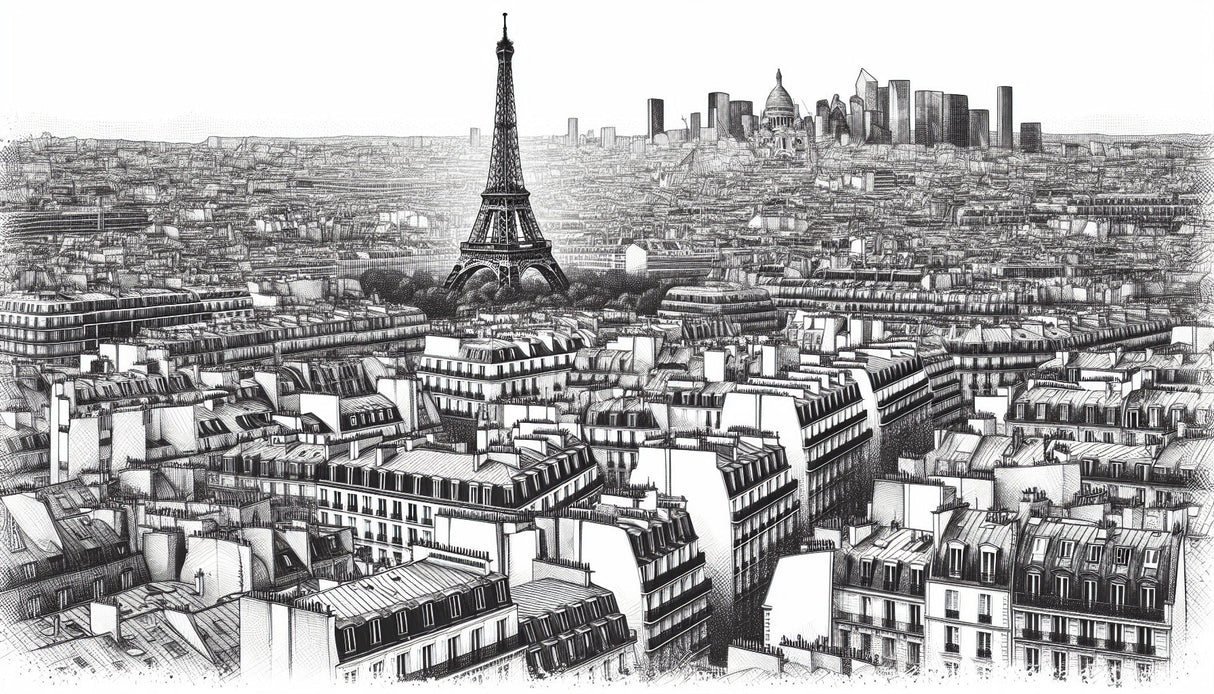 Ce papier peint paysage urbain de Paris capture la beauté emblématique de la capitale française dans une composition sophistiquée en noir et blanc. Le design méticuleusement détaillé, semblable à un croquis, met en valeur la majestueuse Tour Eiffel s'élevant au-dessus d'une mer de bâtiments haussmanniens classiques, leurs toits mansardés distinctifs créant un motif rythmique à travers le paysage urbain. Le papier peint urbain noir et blanc dépeint la grandeur architecturale de Paris avec une précision remarquable et une finesse artistique.