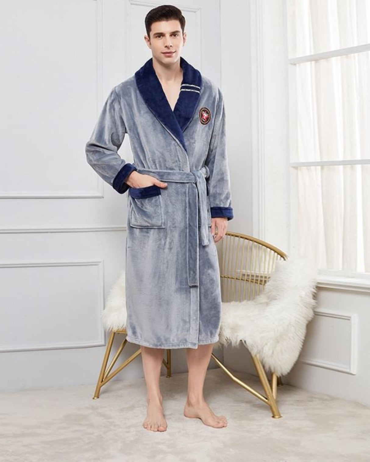Découvrez un confort exceptionnel avec ce peignoir en peluche pour homme conçu pour une détente ultime. Le peignoir en polaire doux présente un corps gris sophistiqué complété par une élégante bordure marine, créant une apparence équilibrée et raffinée pour vos moments quotidiens.