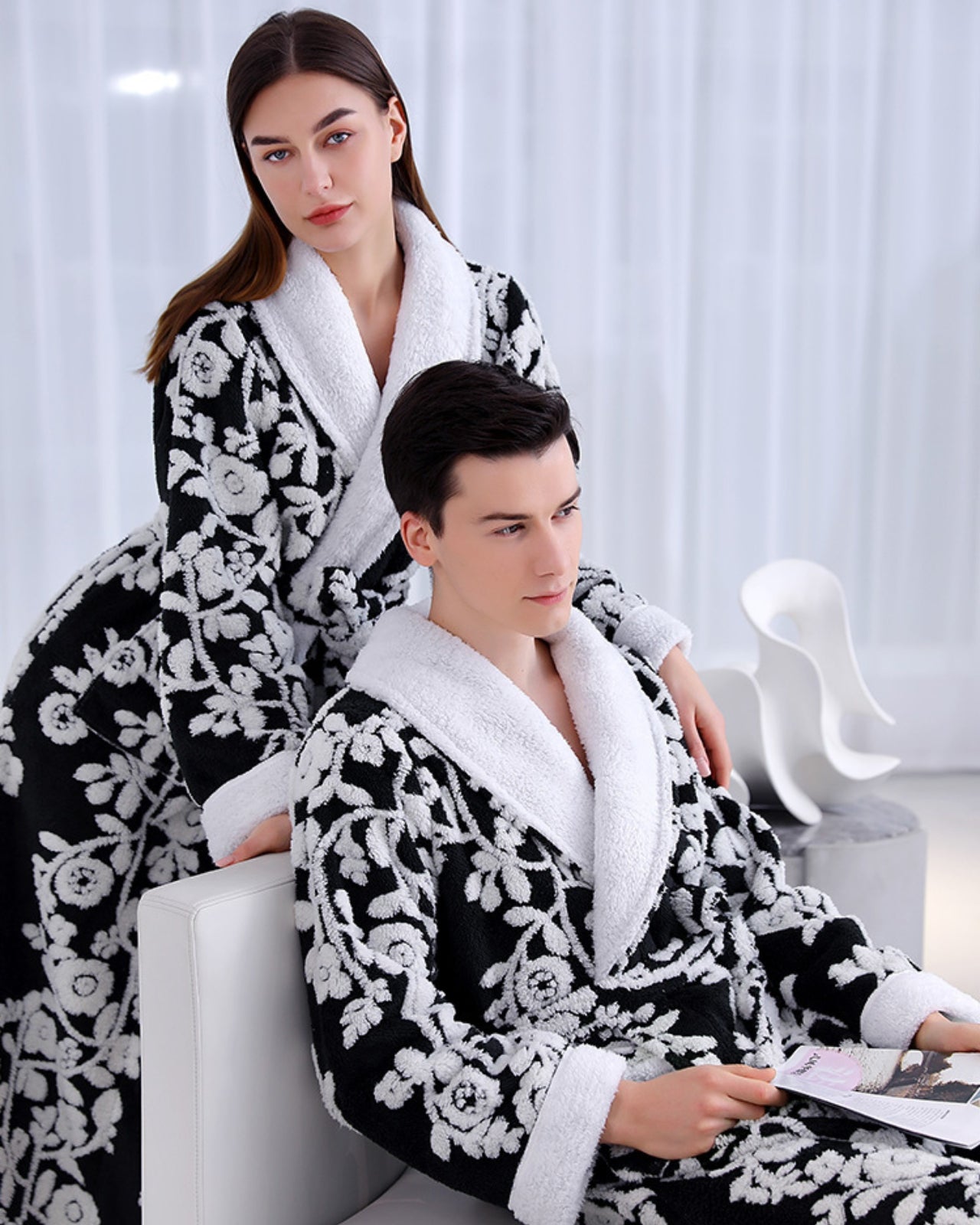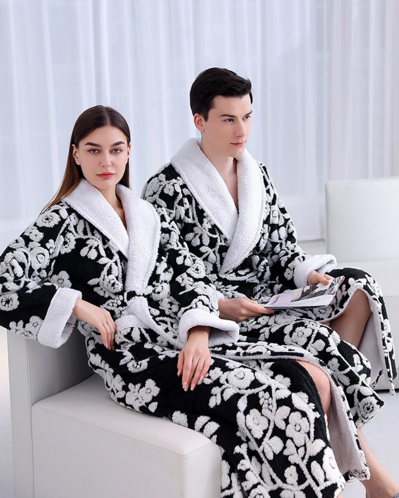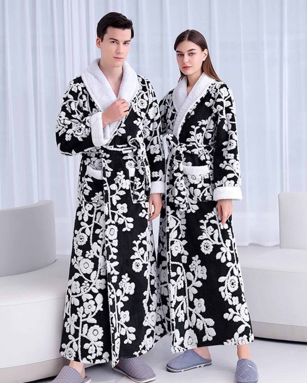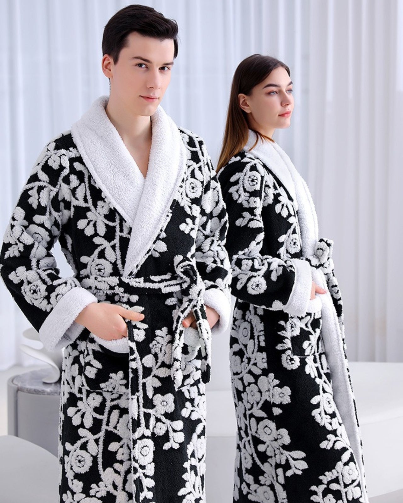 Découvrez un confort et une sophistication inégalés avec ce peignoir floral noir et blanc. Confectionnés en polaire douce et légère, ces peignoirs présentent un élégant motif floral qui ajoute du raffinement à votre collection de vêtements d'intérieur. Les peignoirs assortis pour couple sont conçus avec soin pour s'adapter à différentes morphologies grâce à leur coupe adaptable.