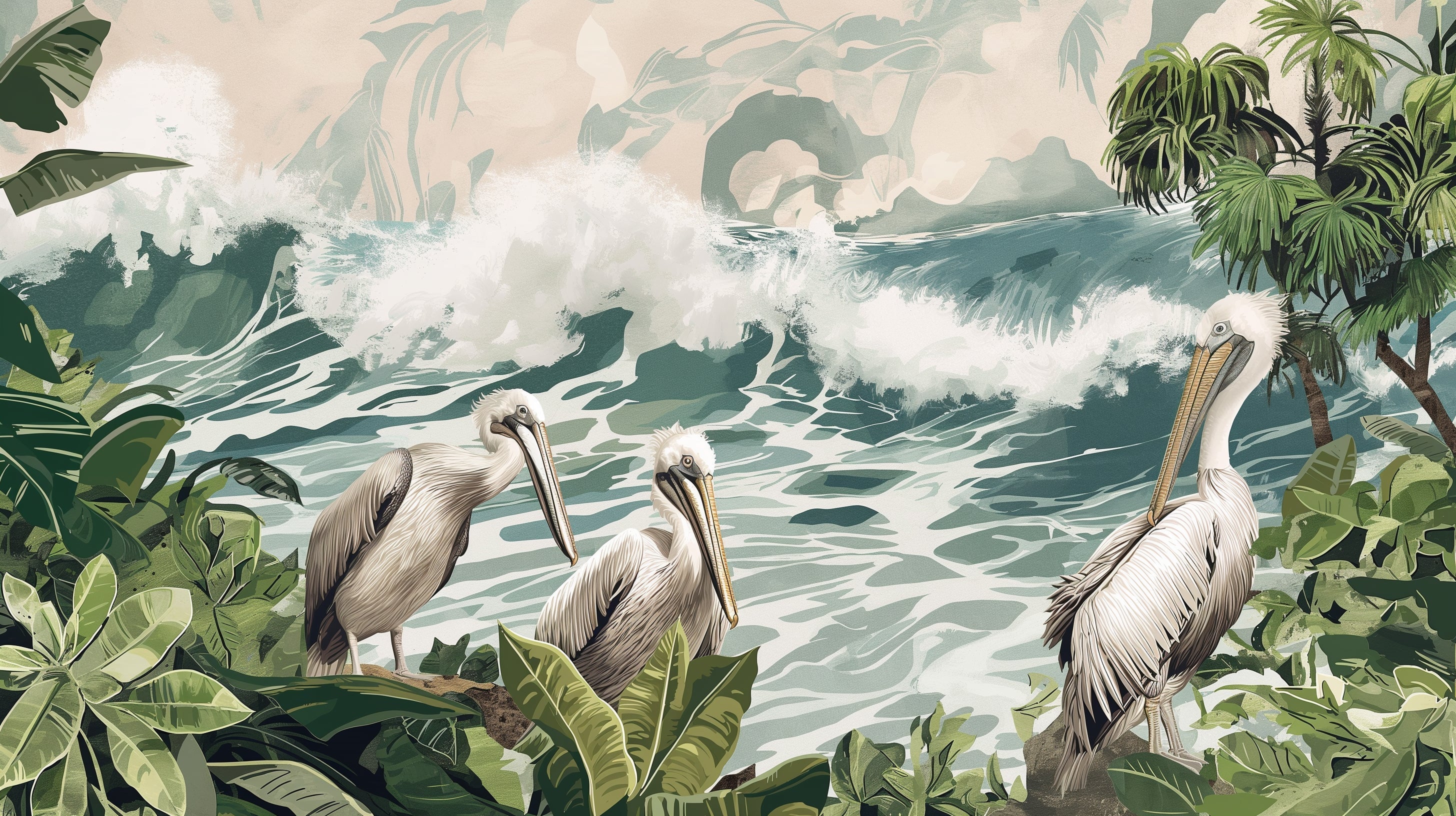 Papier Peint Mural Pélican | Scène de Vagues Tropicales Océaniques