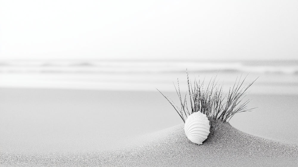 Ce papier peint scène de plage capture l'essence de la sérénité côtière à travers une composition saisissante en noir et blanc. Un coquillage blanc immaculé repose gracieusement sur un lit de sable texturé, accompagné de hautes herbes balayées par le vent qui créent une silhouette dramatique contre l'horizon brumeux. Le papier peint plage minimaliste utilise un jeu magistral de lumière et d'ombre, faisant ressortir les textures naturelles et les formes organiques dans un détail monochromatique époustouflant.