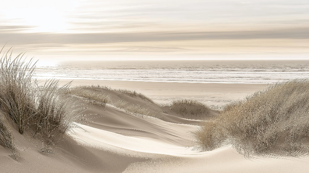 Ce papier peint paysage de plage capture la beauté sereine des dunes de sable côtières dans des tons doux et éthérés. De douces vagues de dunes immaculées balayent le premier plan, leurs formes sculpturales ornées d'herbes balayées par le vent dans des nuances beiges atténuées. Le papier peint paysage côtier s'étend jusqu'à un horizon océanique tranquille, où la mer rencontre le ciel dans un mélange harmonieux de tons crème et gris perle, créant un chef-d'œuvre de minimalisme naturel.