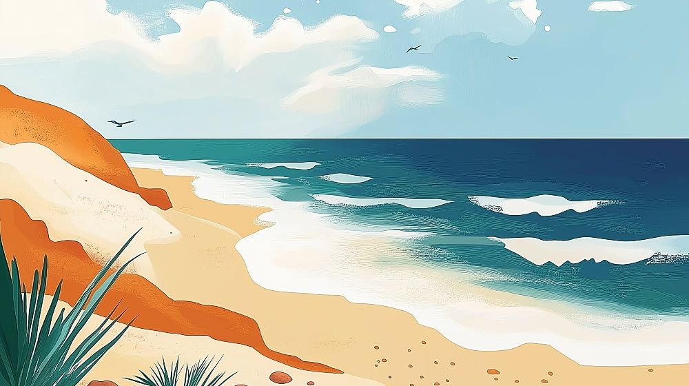 Ce papier peint paysage de plage capture l'essence d'une vue côtière sereine, où des falaises en terre cuite rencontrent des rivages sablonneux immaculés. La composition mélange habilement les visages de falaises orange chaud avec le sable beige doux, tandis que les vagues turquoise de l'océan créent un motif rythmique à l'horizon. De doux nuages blancs dérivent à travers un ciel bleu clair, avec des oiseaux de mer volant librement, ajoutant mouvement et vie à ce paysage marin tranquille.