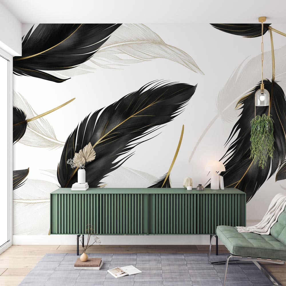 Cette fresque de plumes noire et or transforme les murs ordinaires en œuvres d'art.