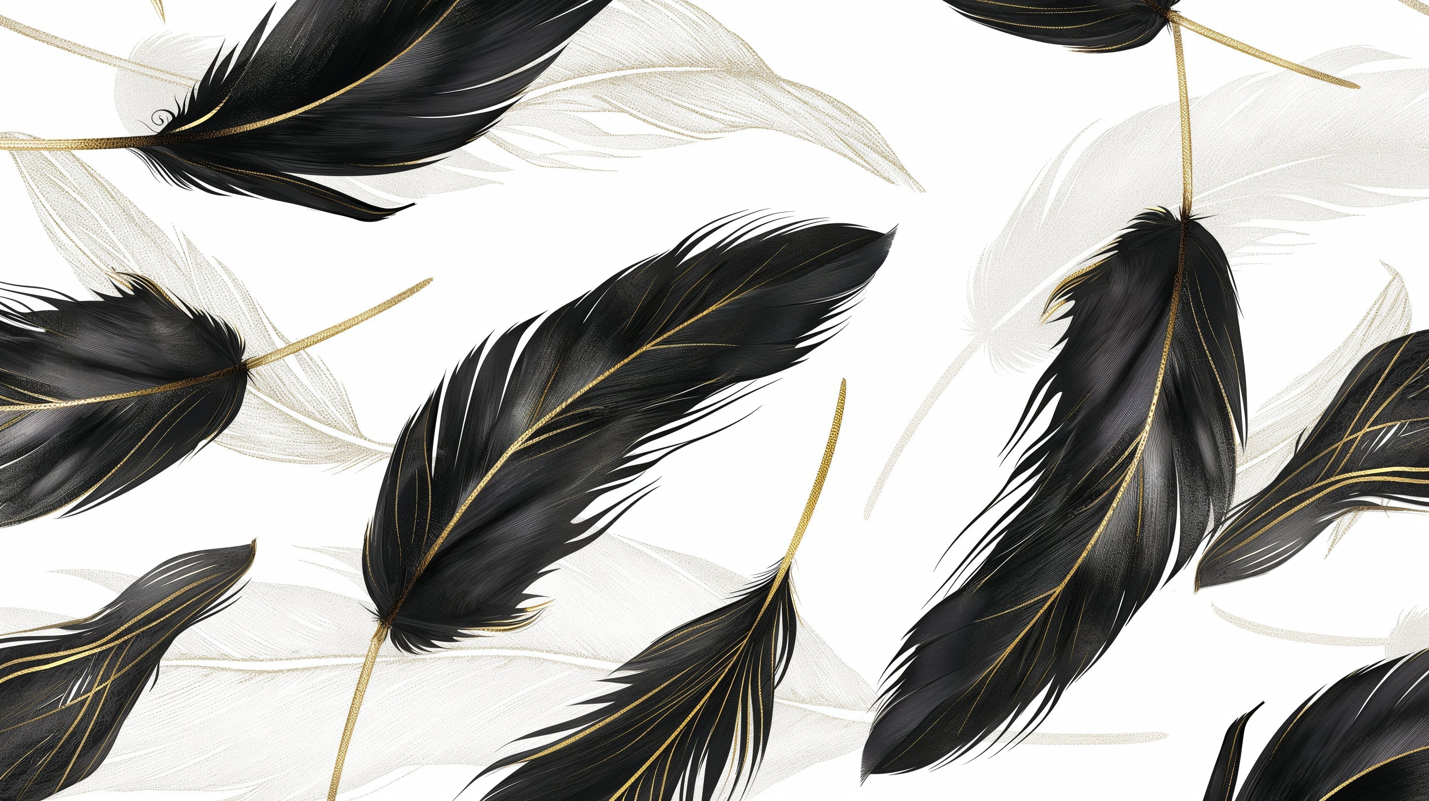 Ce papier peint de luxe à plumes présente un jeu sophistiqué de plumes noires et blanches ornées d'accents dorés brillants. Chaque plume est magnifiquement rendue avec un détail minutieux, créant une danse harmonieuse de lumière et d'ombre sur le fond blanc immaculé. Les délicates veines dorées traversant le papier peint noir et or ajoutent un élément d'opulence raffinée, tout en conservant une atmosphère d'élégance discrète.