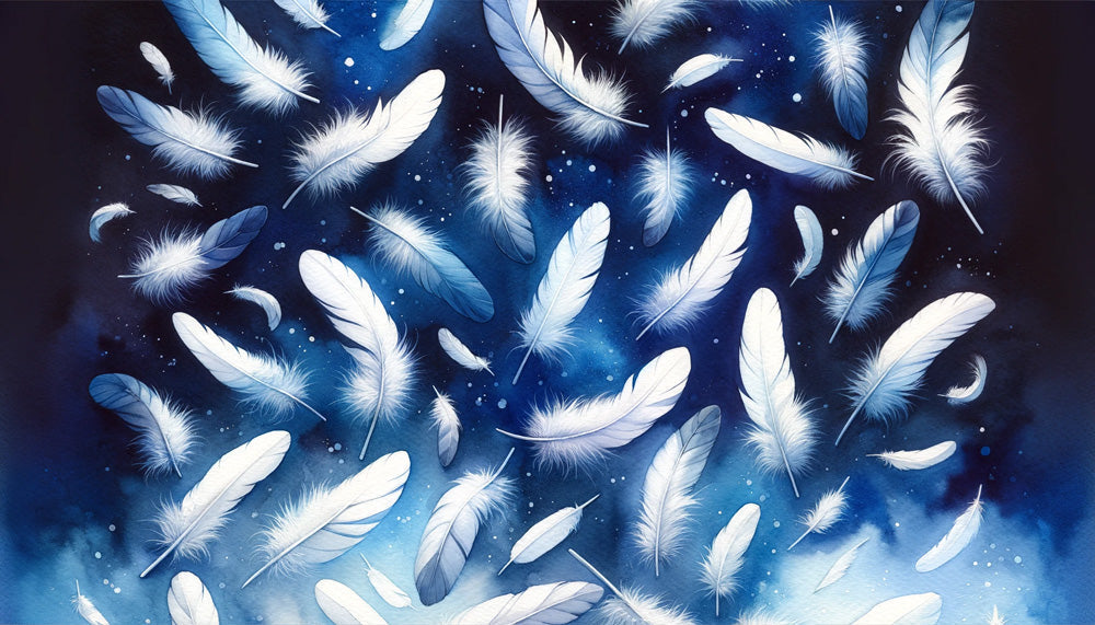 Ce papier peint mural à plumes capture la danse éthérée des plumes contre un cosmos bleu nuit fascinant. De délicates plumes blanches et à pointe bleue flottent gracieusement sur un fond céleste profond, créant un motif onirique rehaussé par de subtils points de lumière étoilée. Le papier peint mural à plumes célestes mêle habilement des techniques d'aquarelle à un détail précis, chaque plume semblant dériver sans poids à travers l'étendue étoilée.