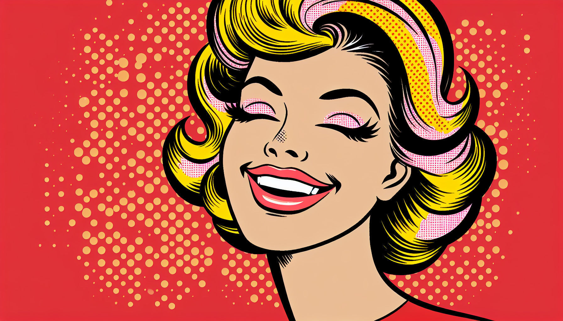 Ce papier peint pop art capture l'esprit audacieux de l'art de bande dessinée vintage avec un impact visuel saisissant. Le portrait dynamique présente une expression radieuse encadrée par des cheveux jaunes et noirs ondulants, sur un fond rouge vibrant parsemé d'accents dorés scintillants. L'utilisation magistrale des points demi-teinte et des lignes audacieuses dans ce papier peint bande dessinée rétro crée une esthétique distinctive qui incarne l'âge d'or de l'illustration pop art.