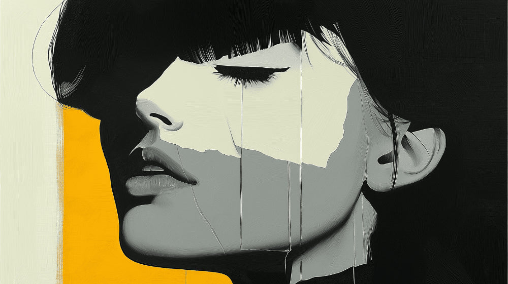 Ce papier peint portrait moderne présente une composition artistique saisissante où des contrastes nets rencontrent une élégance subtile. Le profil monochrome dramatique émerge de noirs profonds et de blancs immaculés, tandis qu'un accent géométrique jaune audacieux ajoute une touche contemporaine inattendue. La fresque murale noire et blanche capture l'essence du design minimaliste à travers ses détails raffinés, des cils délicats aux contours précis qui créent une déclaration visuelle puissante.