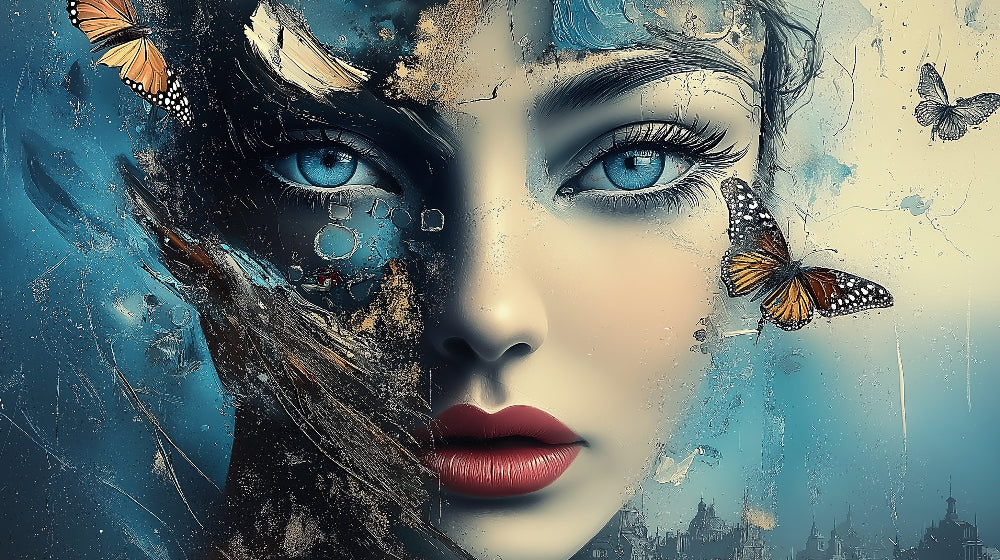Ce papier peint portrait artistique présente une composition fascinante où la beauté éthérée rencontre le design contemporain. Le contraste saisissant entre le turquoise profond et les tons beige doux crée un arrière-plan dramatique pour des yeux bleus perçants qui captent l'attention. De délicats éléments de papier peint mural papillon en ambre riche et noir voltigent à travers la surface, ajoutant mouvement et vie à cette œuvre captivante.