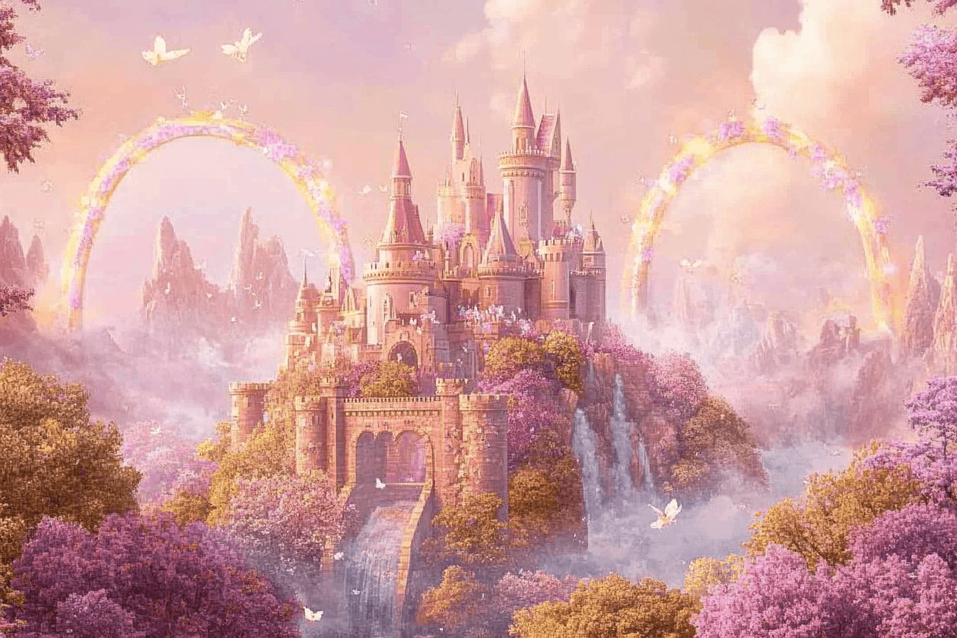 Ce papier peint château de princesse dévoile un royaume magique où la fantaisie rencontre l'élégance dans une scène panoramique à couper le souffle. Le château majestueux s'élève sous un ciel rose doux, ses tours aux teintes dorées atteignant des arches arc-en-ciel éthérées. Le mélange délicat de fleurs roses et violettes entourant le papier peint château de conte de fées crée une atmosphère de rêve, tandis que de douces papillons voltigent à travers le paysage enchanté.