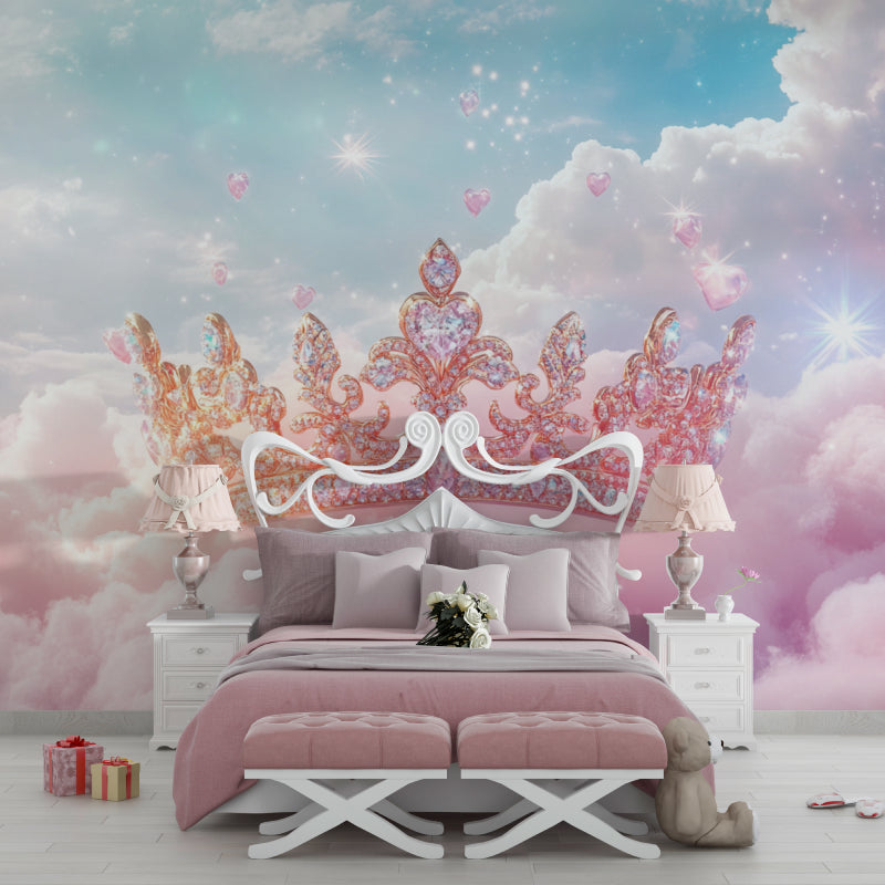 Papier Peint Mural Princesse | Couronne Or Rose avec Cœurs Célestes