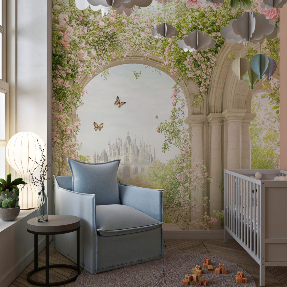Papier Peint Mural Princesse | Jardin Royal avec Château et Papillons