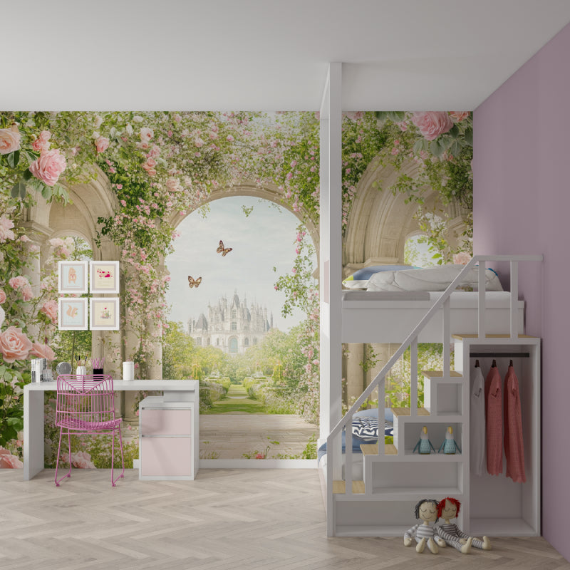 Transformez n'importe quel espace en un sanctuaire éthéré avec ce papier peint jardin royal. Les arcades romantiques et les fleurs en pleine floraison créent profondeur et dimension, tandis que la fresque murale château enchanté ajoute une touche de magie qui captive l'imagination. Parfait pour créer une atmosphère sophistiquée mais fantaisiste, ce design apporte l'enchantement d'un jardin royal à l'intérieur, rendant chaque moment extraordinaire.
