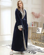 Ce peignoir long en peluche allie confort luxueux et design élégant. Le peignoir femme longueur totale est doté d'un rembourrage en coton de qualité supérieure et d'une bordure en fourrure polyester douce, créant une expérience exceptionnellement confortable. Le tissu bleu marine profond, complété par des accents de fourrure grise, offre à la fois chaleur et style sophistiqué.