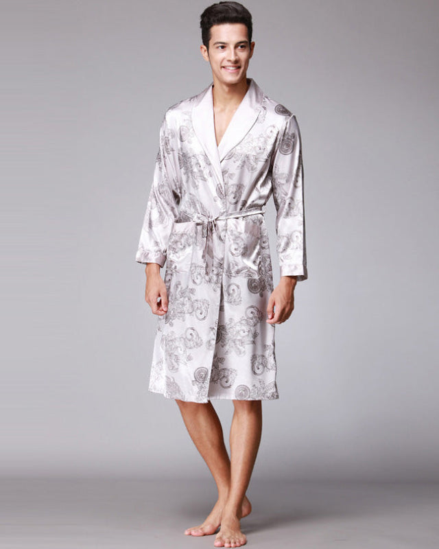 Découvrez l'incarnation du vêtement d'intérieur raffiné avec notre kimono en satin pour homme. Cette pièce sophistiquée allie élégance et confort, avec un imprimé cachemire luxueux sur un tissu en satin blanc de qualité supérieure qui tombe magnifiquement pour un look soigné.