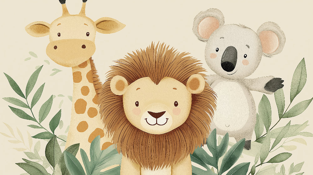 Ce papier peint animaux safari enchanteur donne vie au charme d'une jungle douce avec sa distribution délicieuse de personnages amicaux. Un lion souriant avec une magnifique crinière brune occupe le devant de la scène, accompagné d'une girafe au visage doux et d'un koala attachant, tous rendus dans des tons beiges doux et chauds. Le papier peint animaux de la jungle présente un fond crème apaisant complété par un feuillage vert de style aquarelle, créant une scène harmonieuse et accueillante.